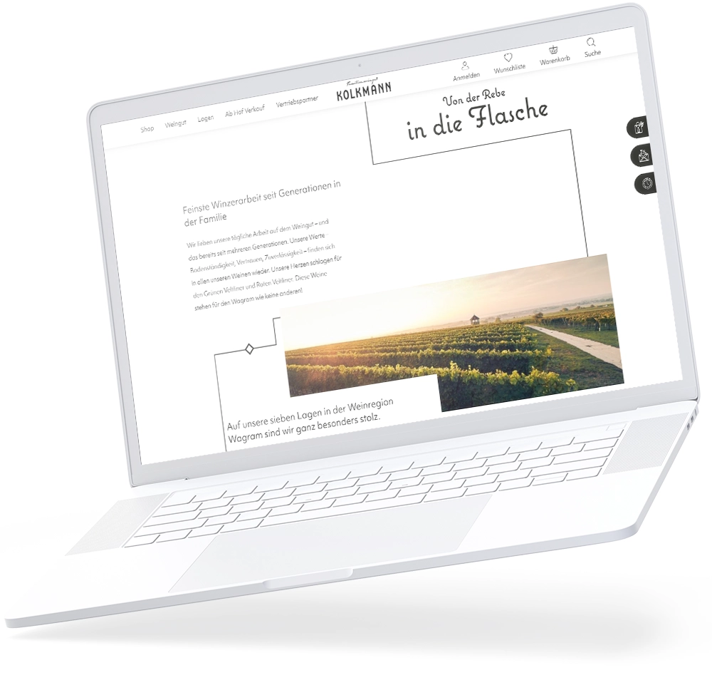 Scroll-Animationen führen Besucher:innen durch die Welt von Kolkmann – von Weinregionen über Winzerportraits bis zu Produkt-Highlights. Jede Sektion erzählt eine eigene Geschichte, emotional und interaktiv. - Intuitiver Online-Shop