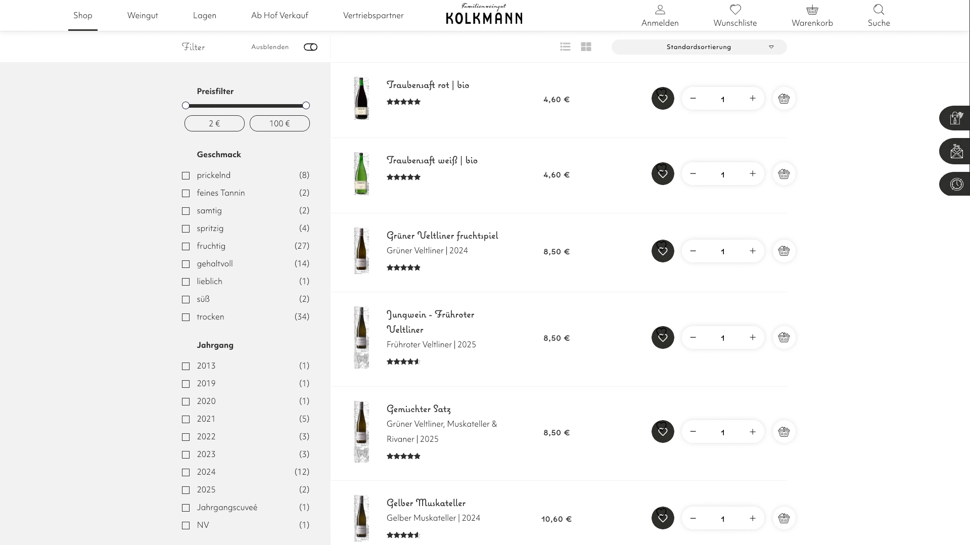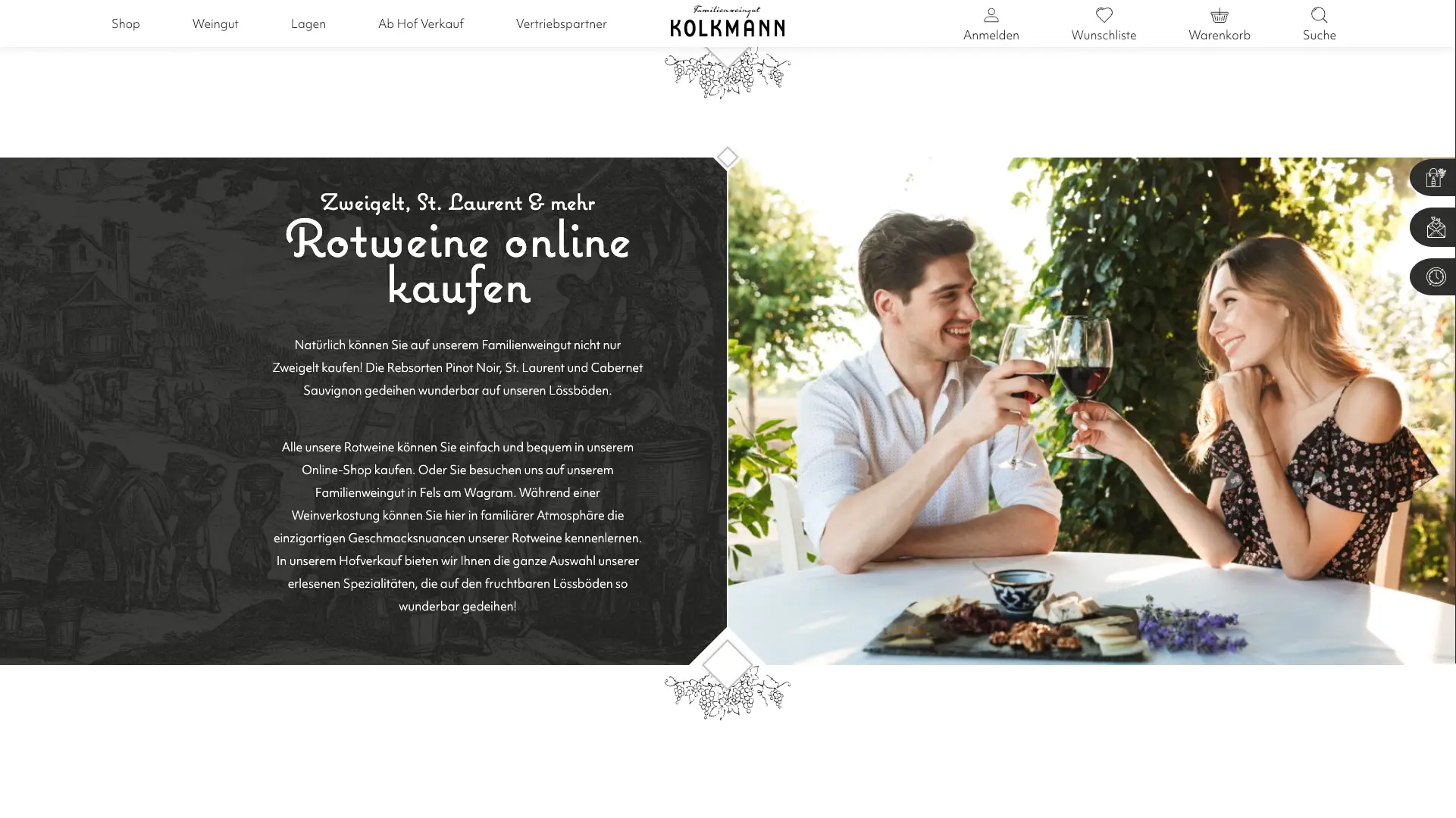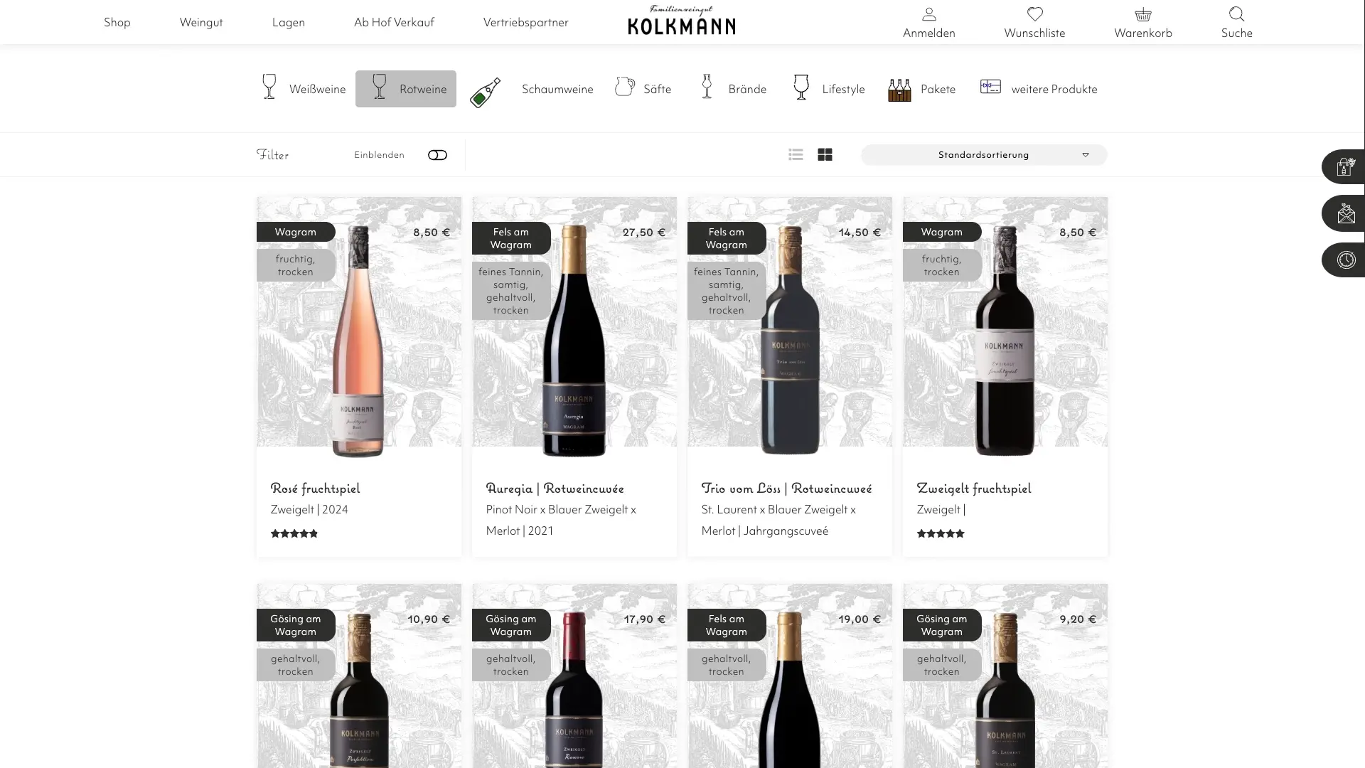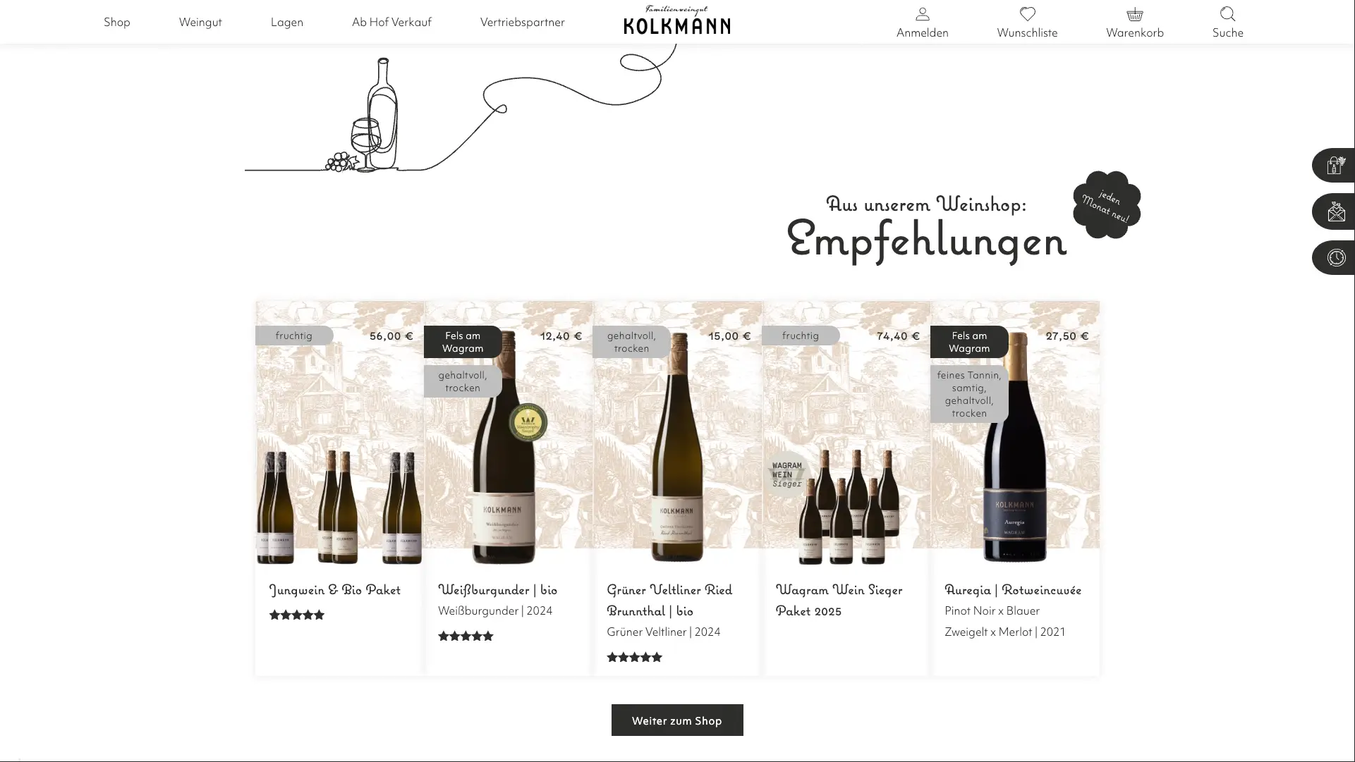 Scroll-Animationen führen Besucher:innen durch die Welt von Kolkmann – von Weinregionen über Winzerportraits bis zu Produkt-Highlights. Jede Sektion erzählt eine eigene Geschichte, emotional und interaktiv. - Intuitiver Online-Shop