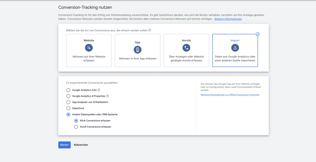 Anschließend erstellen wir eine neue Conversion-Aktion und wählen bei der Art der Conversion “Import > Andere Datenquellen oder CRM-Systeme > Klick-Conversions erfassen” aus.
