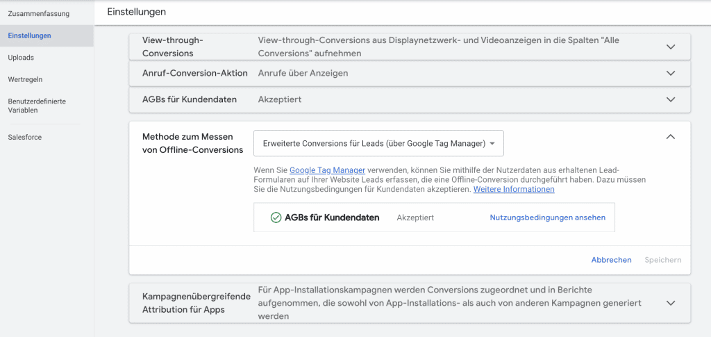 Der erste Schritt besteht darin, eine neue Conversion im Google Ads Interface anzulegen. Dazu setzen wir zuerst bei den allgemeinen Conversion-Einstellungen die “Methode zum Messen von Offline-Conversions” auf “Erweiterte Conversions for Leads (über Google Tag Manager)”.