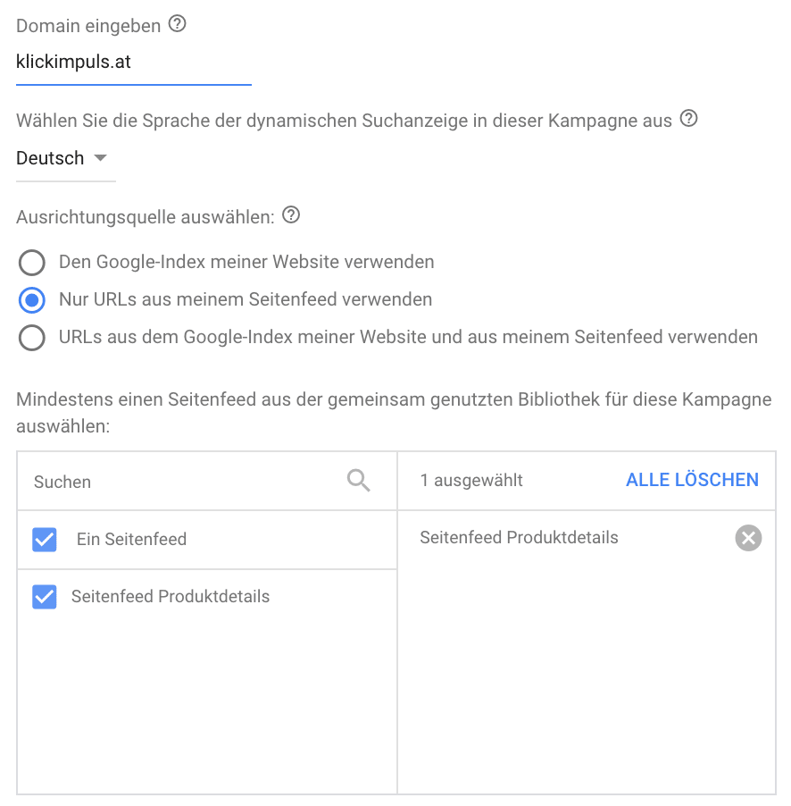 Wir bei KlickImpuls verwenden dazu ein eigenentwickeltes Tool. Dieses ermöglicht es uns, Rohdaten aus dem Merchant Center oder einem XML-Feed in einen DSA-Seitenfeed zu transferieren. Via Zuordnungsregeln werden die Ziel-URLs in der gewünschten Art und Weise gelabelt. Durch einen täglichen Datenimport wird sichergestellt, dass der DSA-Seitenfeed immer auf dem aktuellen Stand ist. Einmal korrekt eingerichtet, stellt die laufende Betreuung der Feeds so gut wie keinen Aufwand mehr da. Somit kann der Fokus verstärkt auf das Kampagnenmanagement gelegt werden.