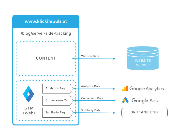 Um zu verstehen, wie Server-Side Tagging funktioniert, ist es wichtig zu wissen, wie die Daten mit dem klassischen Tagging gesammelt und verarbeitet werden.