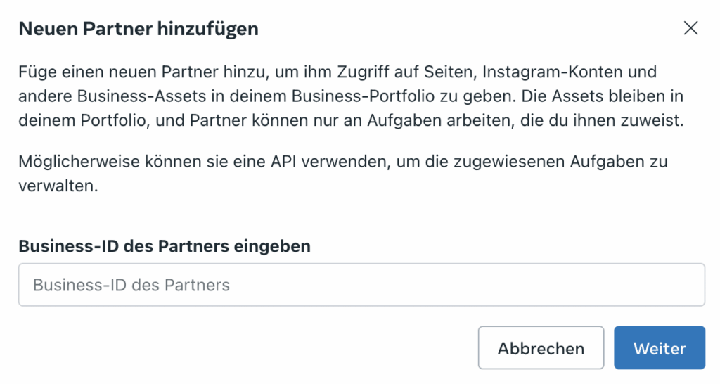 3. Business-ID eingeben: Gib im dafür vorgesehenen Feld die Business-ID der Agentur oder des Partners ein. Diese wird dir von deiner Ansprechperson zur Verfügung gestellt.