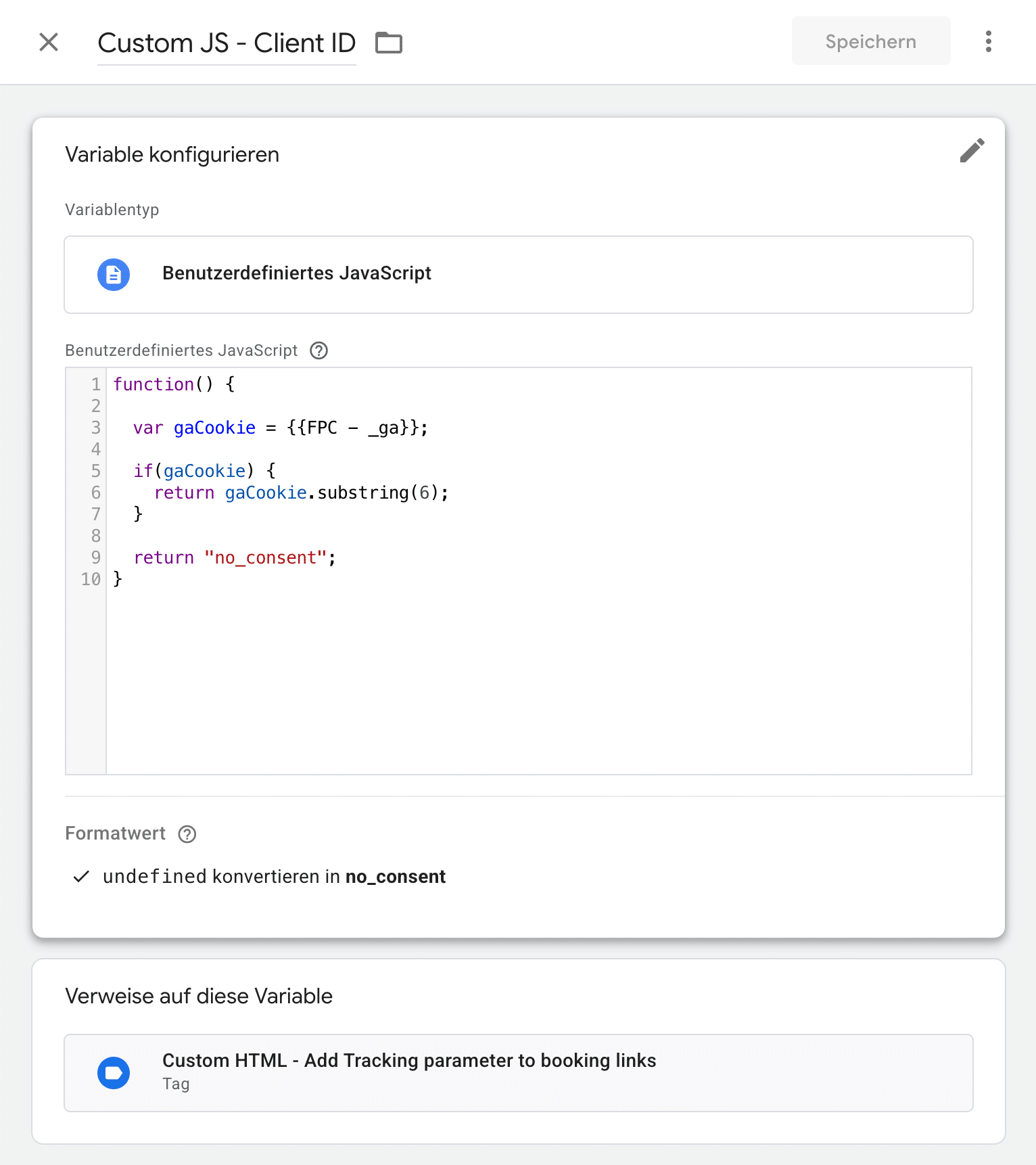 Diese Anpassung erfolgt clientseitig direkt im DOM und funktioniert zuverlässig, ohne dass die ursprünglichen Links auf der Website manuell verändert werden müssen. Das Custom HTML-Tag kann auf allen Seiten ausgelöst werden, auf denen Buchungslinks enthalten sein könnten, sowie idealerweise bei einem Klick auf den Cookie-Banner, da sich hier der Consent nach dem Seitenaufruf ändert und die entsprechenden Cookies verspätet gesetzt werden.