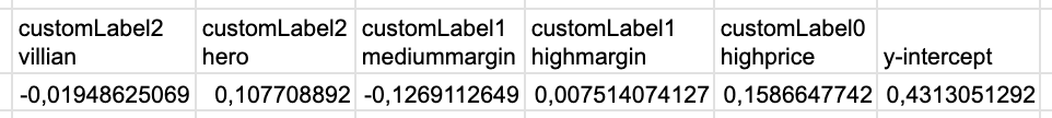 Ein positives Vorzeichen bedeutet, dass das Attribut einen positiven Einfluss auf den Wert/Klick hat, wobei der Abstand zu 0 die Signifikanz darstellt. “y-intercept” ist die Basis, von dem aus der Score für jedes Produkt berechnet wird.