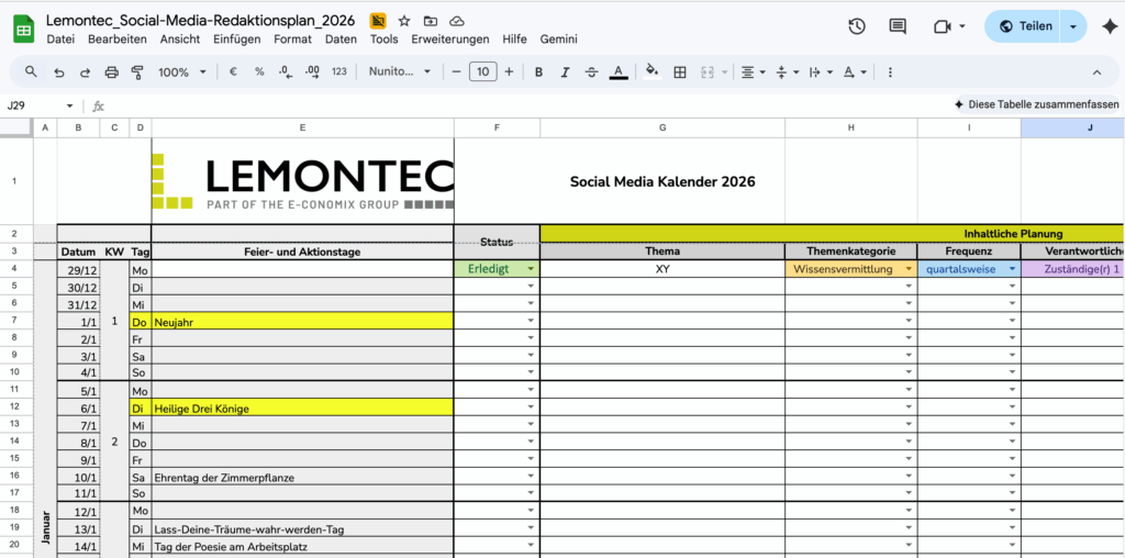 Wir stellen dir unseren Lemontec Redaktionsplan für 2026 kostenlos über Google Sheets zur Verfügung. Dafür benötigst du lediglich einen Google Account. Nachdem du unten auf den Download-Button klickst bekommst du eine E-Mail von uns mit dem Link zum Dokument. Sobald du den Redaktionsplan öffnest, kannst du dieses zuerst nur als Betrachter ansehen und noch nichts verändern. Unter “Datei” kannst du den Planer ganz einfach kopieren und in deinem Google Drive Account abspeichern oder ihn herunterladen. Danach hast du den vollen Zugriff auf alle Funktionen.