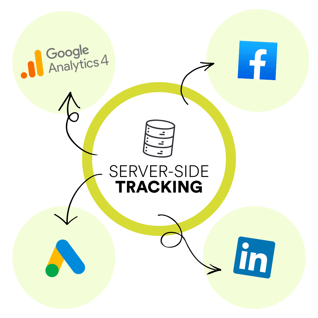 Beim Server-Side Tracking werden die Analyse-Daten zuerst an einen eigenen Server geschickt, bevor diese an Tools wie Google Analytics, Google Ads & Co weitergeleitet werden.